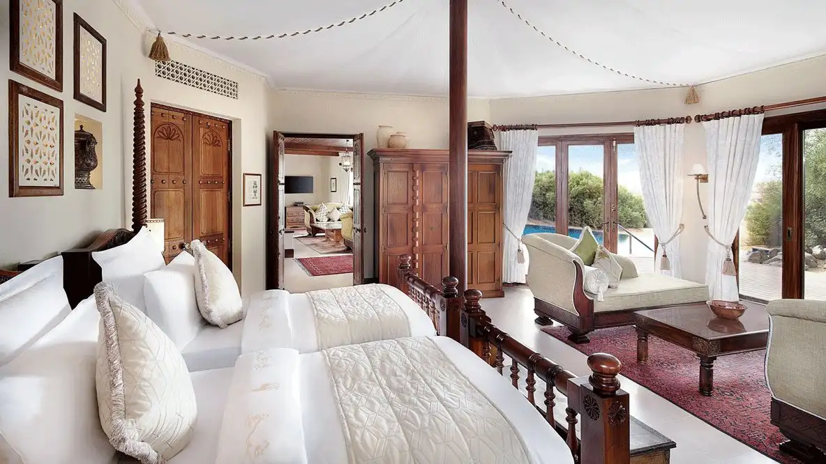 Indulge in an opulent suite, beautifully adorned with exquisite Arabian decor, antiques, and unique artifacts. Each suite offers a perfect blend of elegance and seclusion, making it likely that your closest companions will be the charming wildlife wandering around the grounds. The Arabian canopies harmonize with the desert landscape, creating a serene atmosphere. Enjoy exceptional hospitality, with dedicated staff ready to cater to your every need.