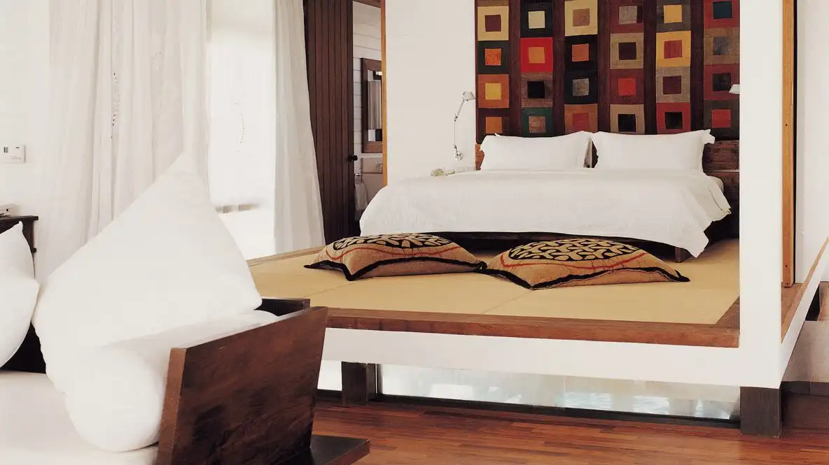 Each bungalow draws inspiration from traditional Maldivian fishing boats, resembling a Dhoni from the outside, and is connected to neighboring bungalows via charming wooden walkways. Once you enter your private sanctuary, you’ll discover a stylish beach-inspired interior featuring airy white drapes, sun-bleached wood, and a thatched roof. The decor is elegantly simple yet opulent, reflecting the local culture. Whether you’re enjoying a swim straight from your deck or simply soaking in the serene surroundings, your elevated retreat promises to be an escape you’ll cherish.