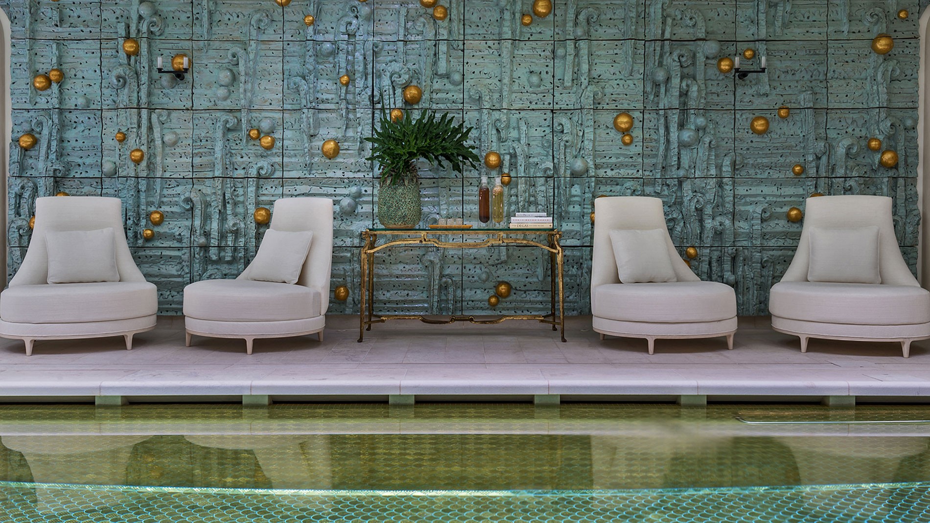 - the swimming pool features an opulent design with 17,600 gold mosaic tiles