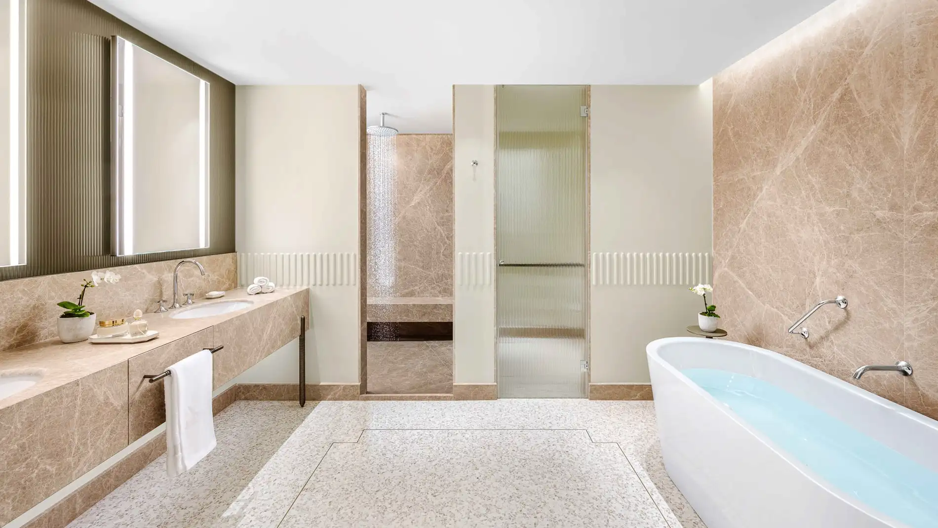 - Bathrooms in the guest rooms are generously sized and opulent, adorned with marble and gold accents.