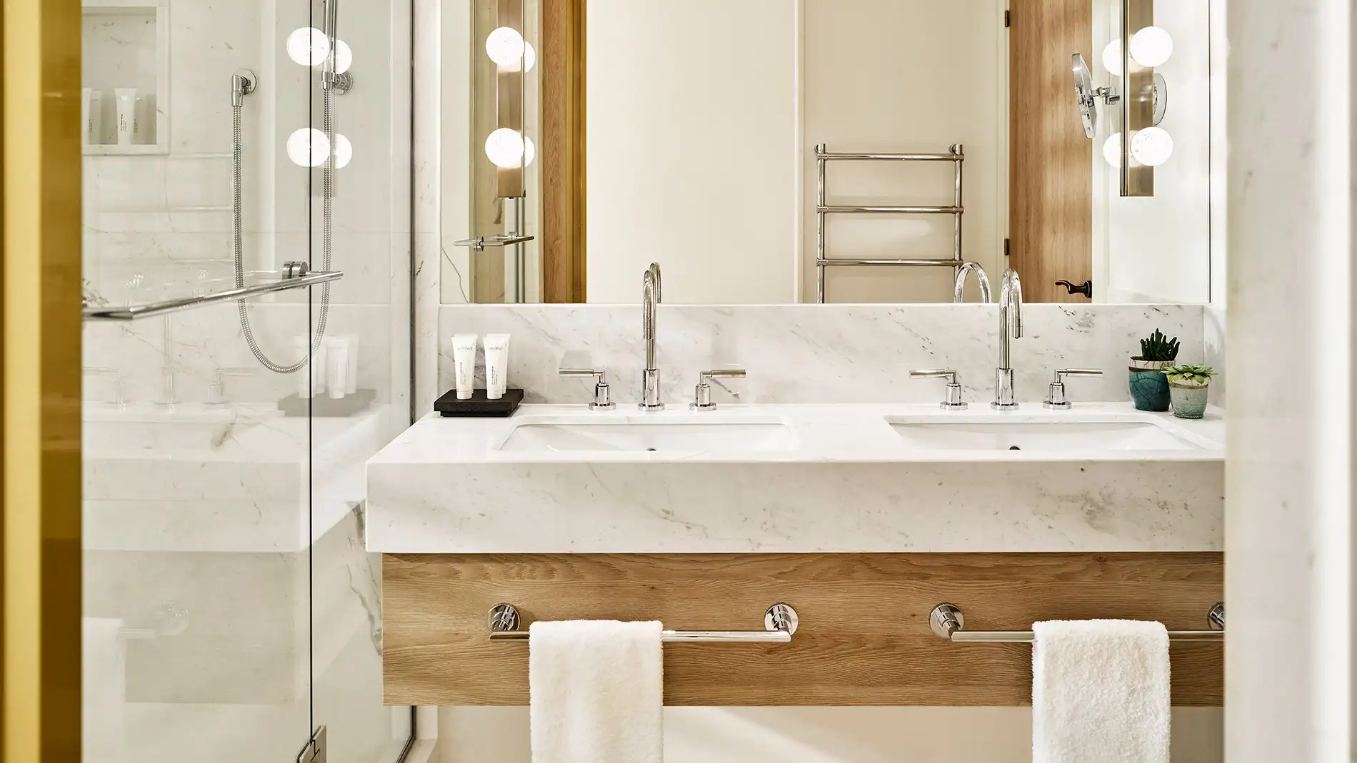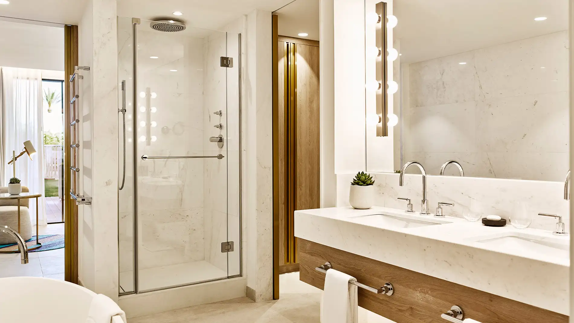 - The bathroom, adorned with Persian marble, includes a rain shower and a separate vanity area.