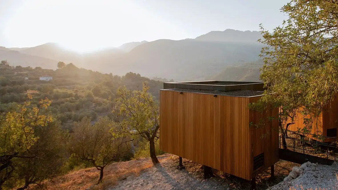 Nestled in the southeastern area of the Guadalest hills, VIVOOD Landscape Hotel is situated in a picturesque Spanish valley. This unique accommodation harmoniously blends the rugged landscape with the minimalist design of its cabins, ensuring guests have an unforgettable getaway. The hotel is conveniently located near El Castell de Guadalest, known as one of Spain’s most charming villages, and is only a 25-minute drive from the beautiful beaches of Benidorm and Altea. For those looking to explore further, Alicante is just a quick 50-minute drive away. VIVOOD serves as an ideal starting point for discovering local restaurants, wineries, and nearby towns.